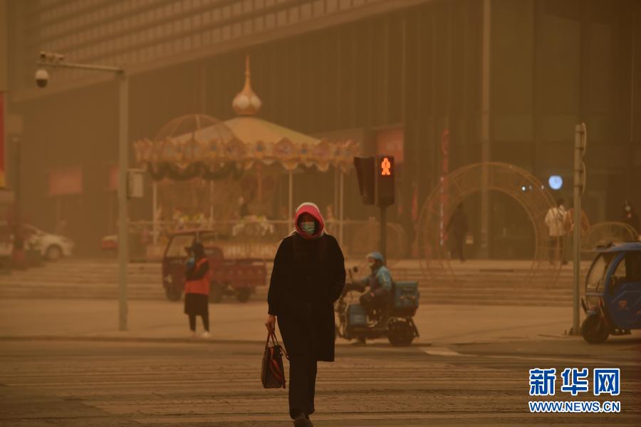 3月15日,寧夏銀川市民在沙塵中通過十字路口。當日,我國北方多地出現沙塵天氣。新華社記者 唐如峰 攝