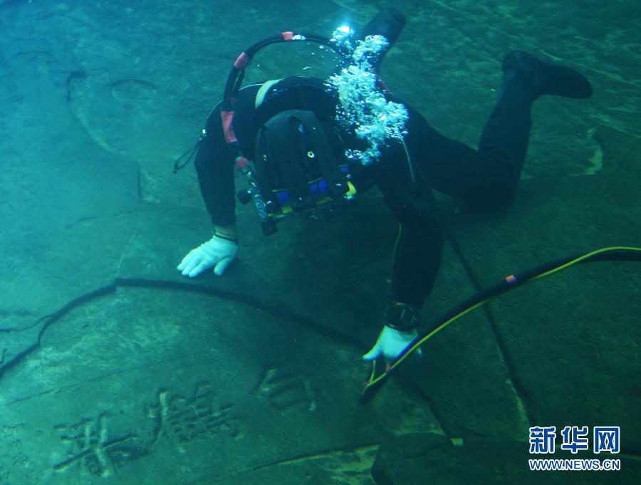 3月15日,在長江水下40多米的白鶴梁題刻無壓容器罩內,潛水員在對題刻上的泥沙進行清理。新華社記者 王全超 攝