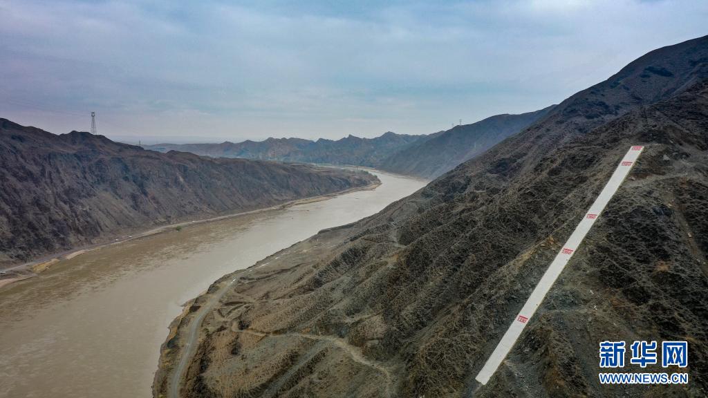 這是位(wei)于寧夏中衛市黃河(he)黑山峽河(he)段的水位(wei)標(biao)記(ji)(4月3日(ri)攝(she),無人機照(zhao)片(pian))。