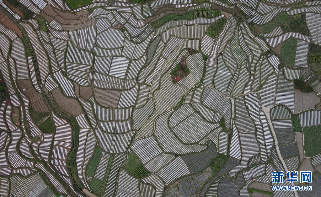 4月5日在貴州(zhou)省遵義市余慶縣白(bai)泥鎮團(tuan)結村(cun)烏(wu)楊大壩現代農業(ye)蔬(shu)菜種植示范區拍攝的田(tian)園風光(無(wu)人機照(zhao)片)。