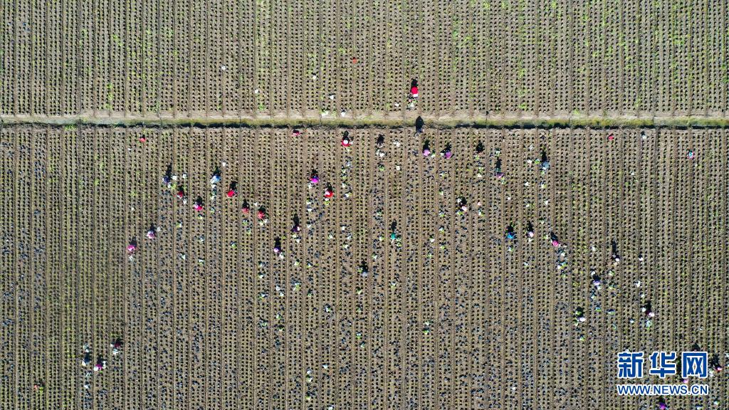 4月(yue)5日,江蘇省宿遷市沭陽縣劉集鎮(zhen)南長莊村農民在田間(jian)勞(lao)作(無人機照片)。