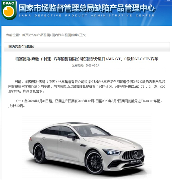 5日,梅賽德斯-奔馳(中國)汽車銷售有限公司宣布將召回共計1460輛進口AMG GT、C級和GLC SUV汽車,且三款車型召回原因各不相同。