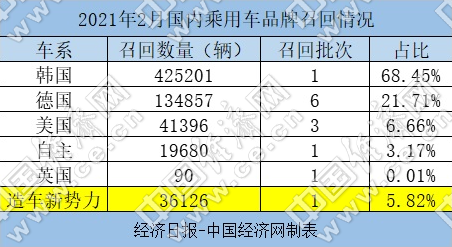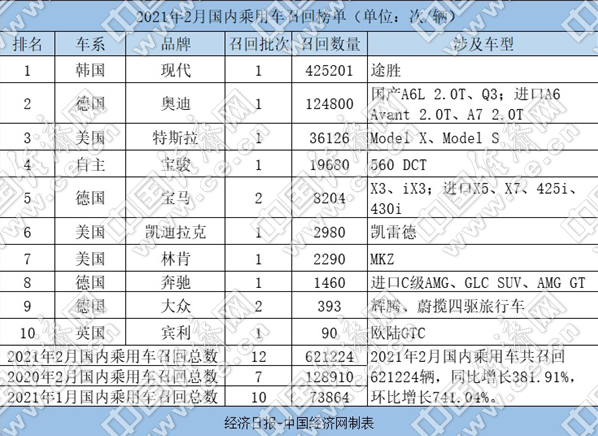 根據國家市場監督管理總局缺陷產品管理中心2月份發布的召回公告,經濟日報-中國經濟網汽車頻道經過匯總、統計,整理出“2021年2月國內乘用車召回榜單”。2月,國內乘用車市場共有10個品牌累計發布11起公告,共計召回乘用車621224輛,同比增長381.91%,環比增長741.04%。