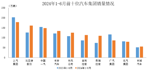 從企業市場層面數據來看,今年1-6月,汽車銷量排名前十位的汽車集團中有6家實現了同比正增長。包括比亞迪、奇瑞、長安汽車、吉利汽車、東風汽車等在內的多家車企增速較為顯著,交出了一份令人滿意的成績單。