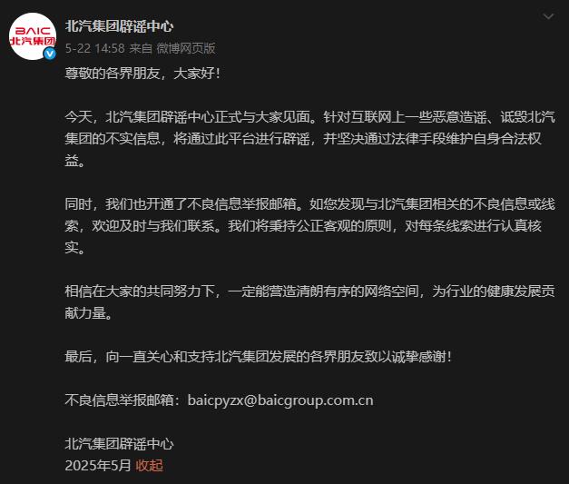 5月22日,北汽集團辟謠中心官微上線。據介紹,北汽集團辟謠中心主要針對互聯網上一些惡意造謠、詆毀北汽集團的不實信息,將通過此平臺進行辟謠,并堅決通過法律手段維護自身合法權益。