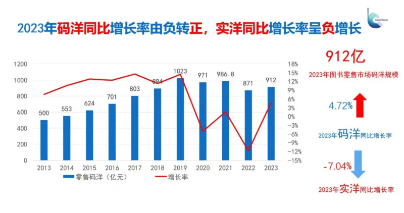 開卷數據顯示,我國圖書零售市場規模(碼洋)從2013年的500億元發展到2023年的912億元,年均增速超5%,實現了平穩發展。