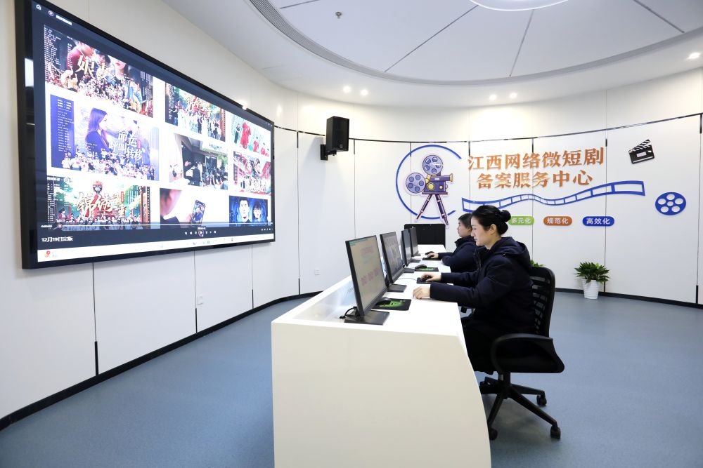 董茵是一名“劇管家”。2024年6月,江西網絡微短劇備案服務中心在贛江新區掛牌成立,13名“劇管家”持證上崗,采取一對一服務模式,提供“全生命周期”服務。“我們就像‘產業保姆’,提供從劇本構思、備案審批到政策支持、場景協調的全程服務,企業只需專注創作。” 董茵說。