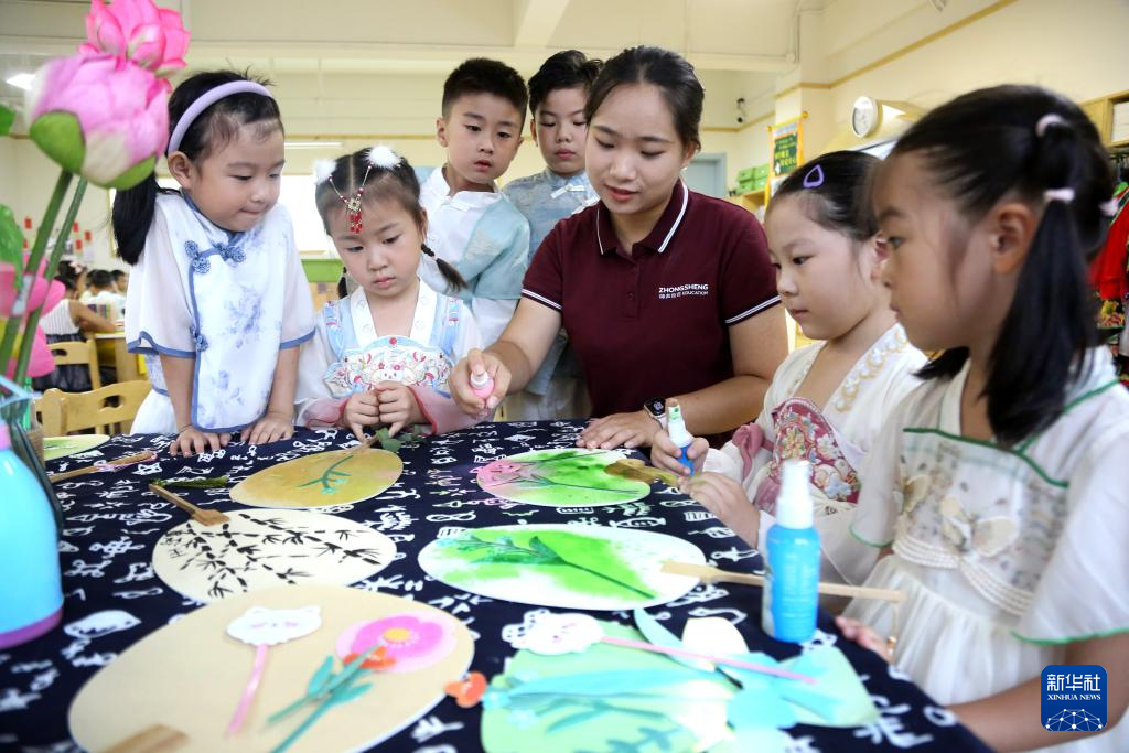 9月11日(ri),在江蘇省連(lian)云港(gang)市(shi)鐘聲幸福幼(you)兒園,老師指導小朋(peng)友制作中秋(qiu)團扇(shan)。