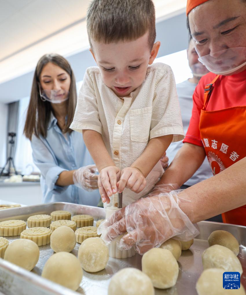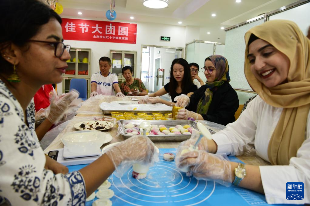9月11日,在江(jiang)蘇省(sheng)鎮江(jiang)市金湖(hu)社區,江(jiang)蘇大(da)學(xue)的外國留學(xue)生和居民一起制作月餅。
