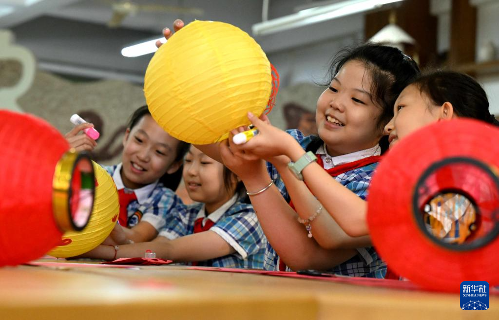 9月11日,在河(he)北省石(shi)家莊市橋西外國語小學(xue)迎(ying)中秋(qiu)活動中,孩(hai)子們在制作花燈。