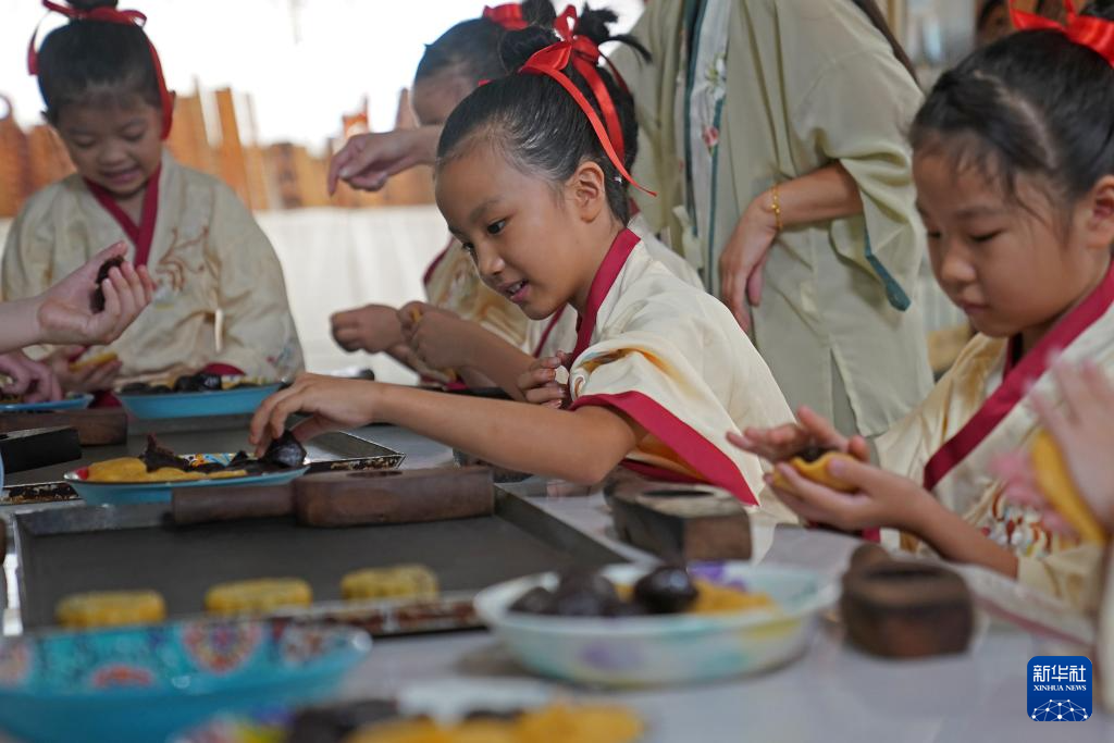 9月11日,孩(hai)子們在活動上體(ti)驗(yan)傳統手工月餅制(zhi)作。
