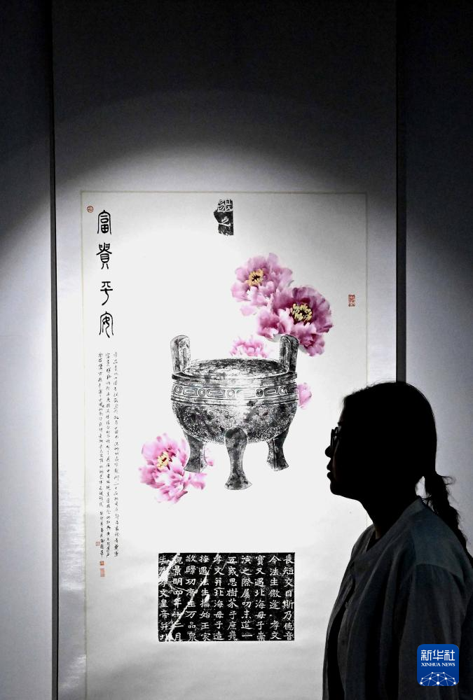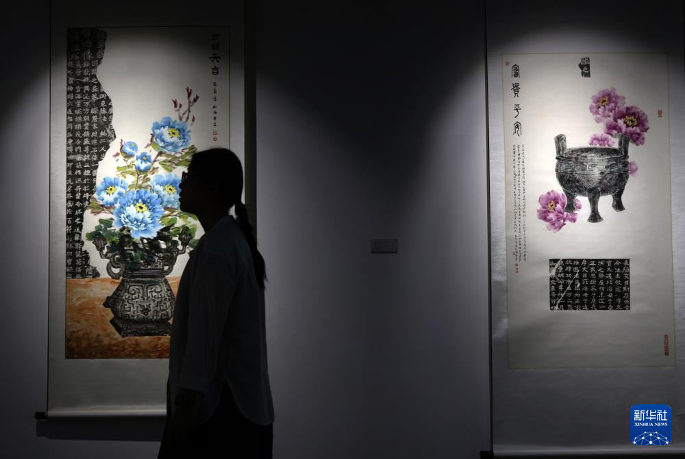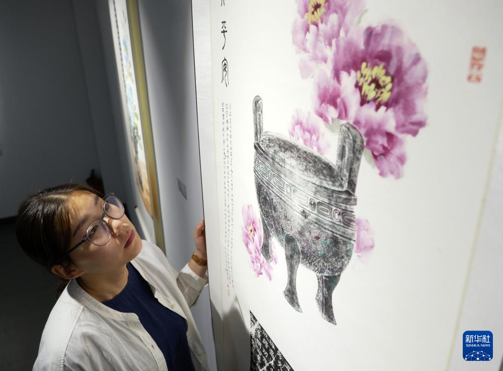 在洛陽華夏金(jin)石文化博物館,錢(qian)夏玉在觀看(kan)金(jin)石博古畫成(cheng)品(9月11日攝)。