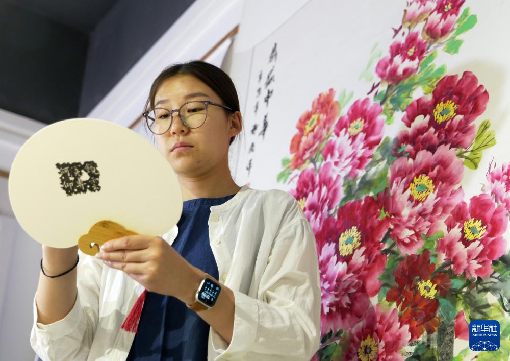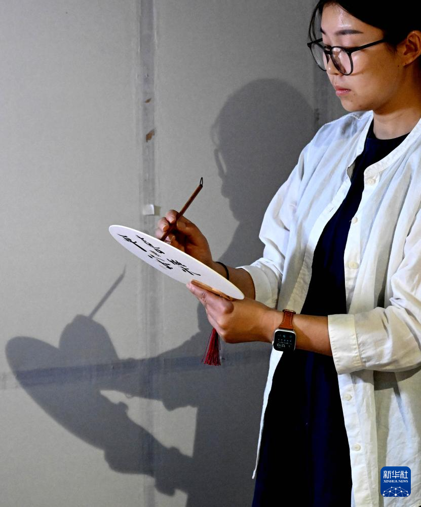 錢夏玉在洛陽華夏金石文(wen)化博(bo)物館內進行金石博(bo)古(gu)畫文(wen)創團扇創作(zuo)(9月11日(ri)攝)。