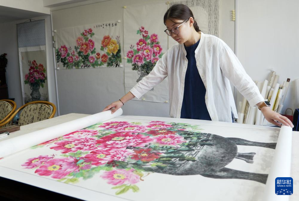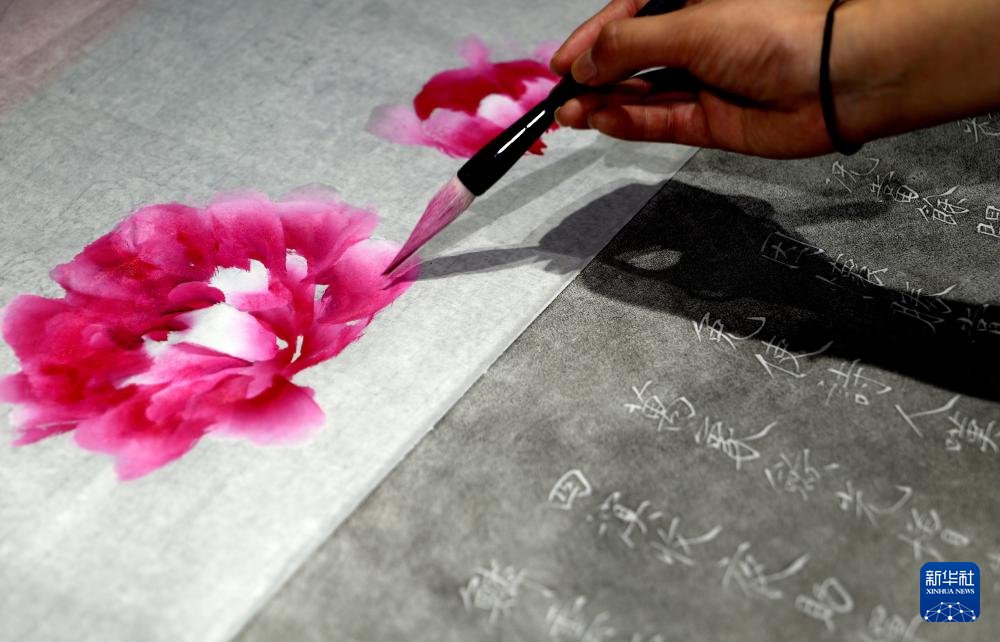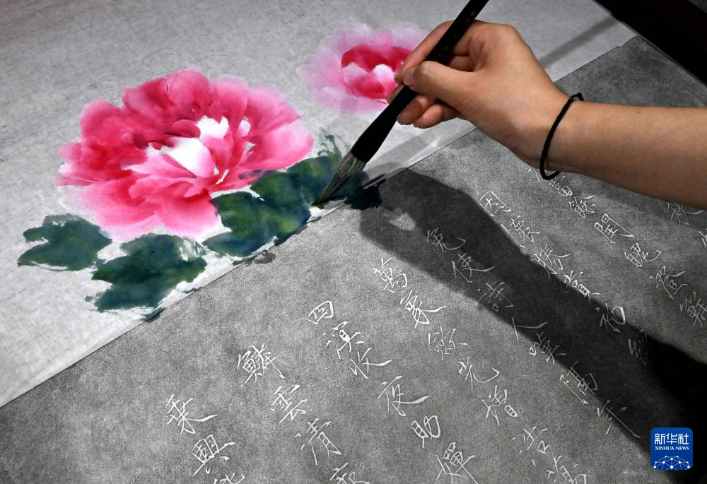 在洛陽龍(long)門畫院,錢夏玉在拓印(yin)完成的金(jin)石拓片上補繪牡丹畫(9月11日(ri)攝)。
