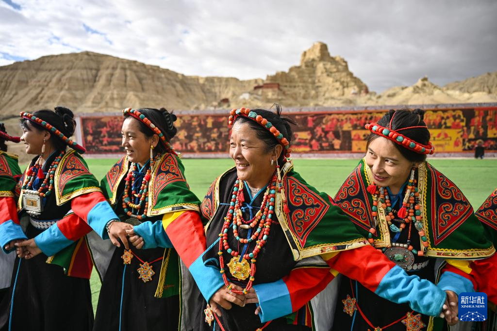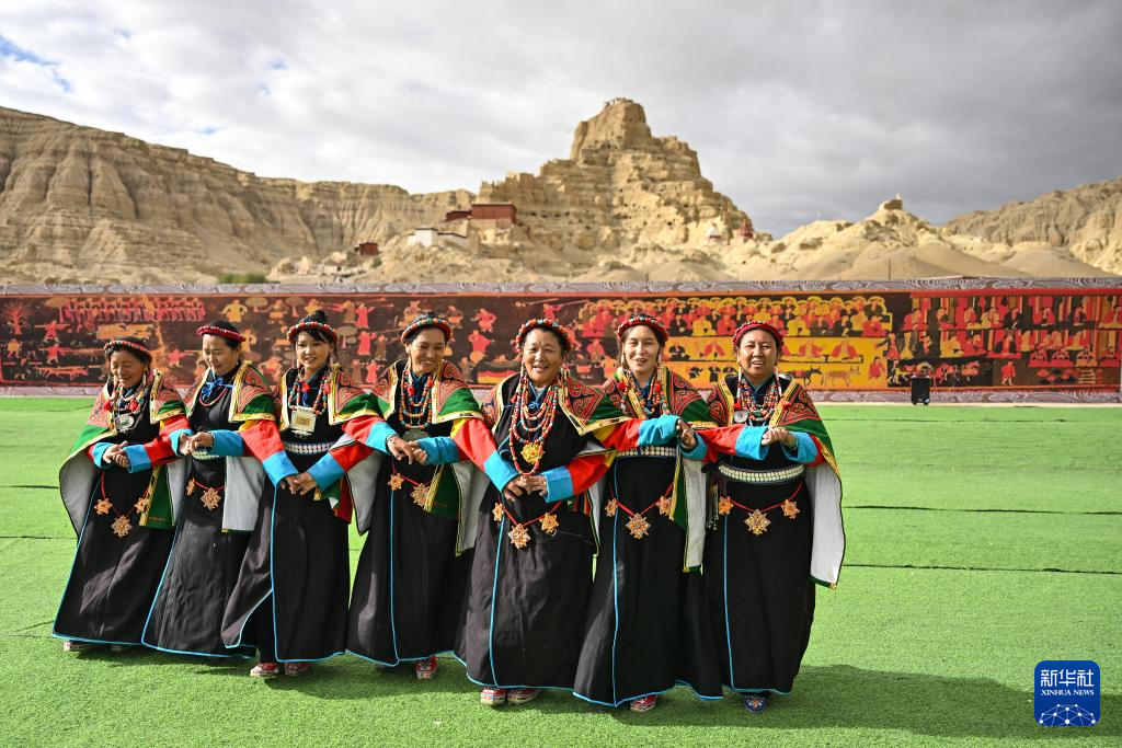 在西藏阿里地區札達縣(xian)古格王國遺址腳下,當地村民表(biao)演“宣舞(wu)”后互相交流(9月11日攝)。