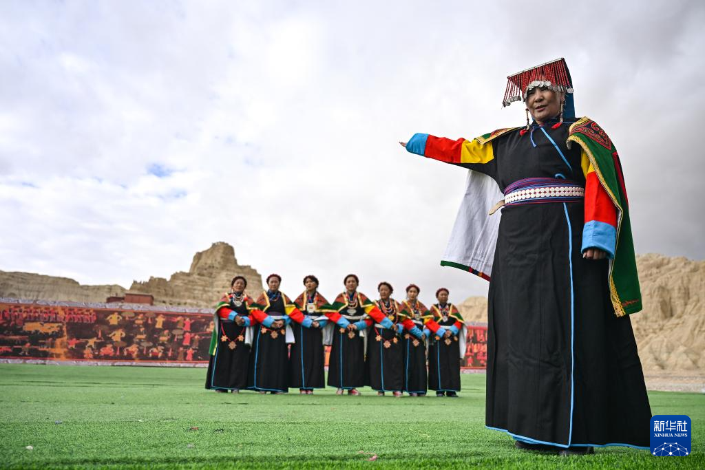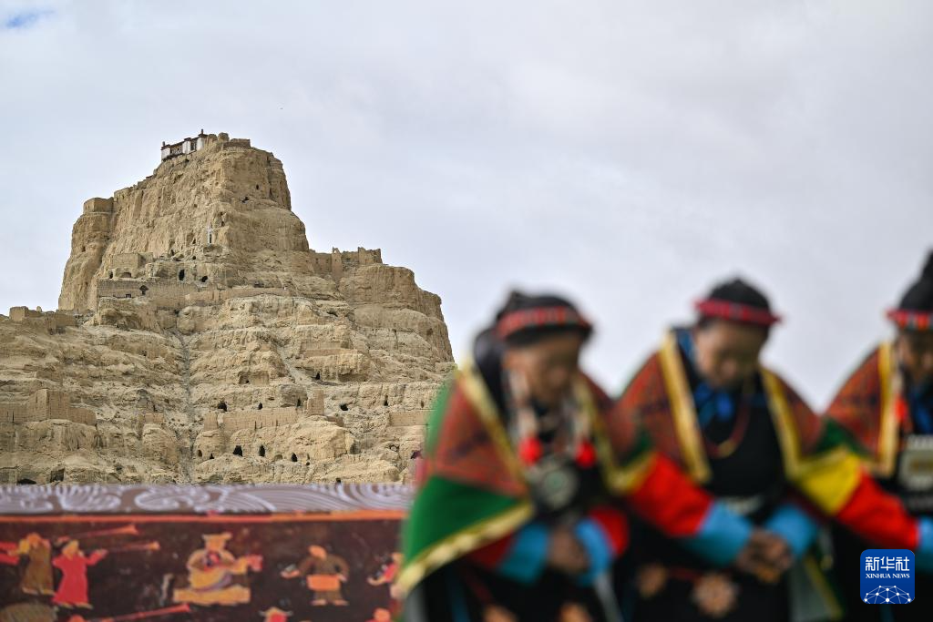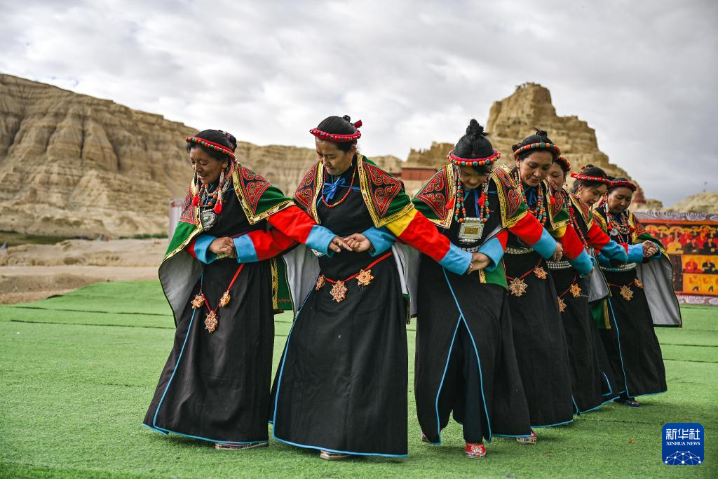 在西藏(zang)阿里地區札達縣古格王國遺(yi)址腳下,當(dang)地村民表演“宣舞(wu)”(9月11日攝)。