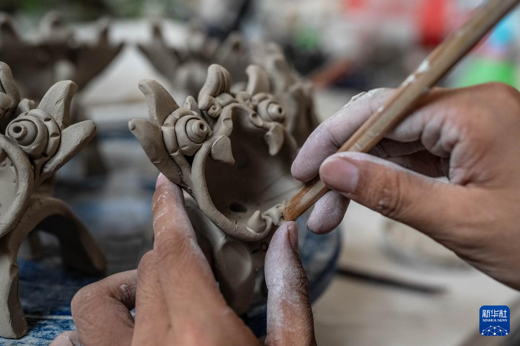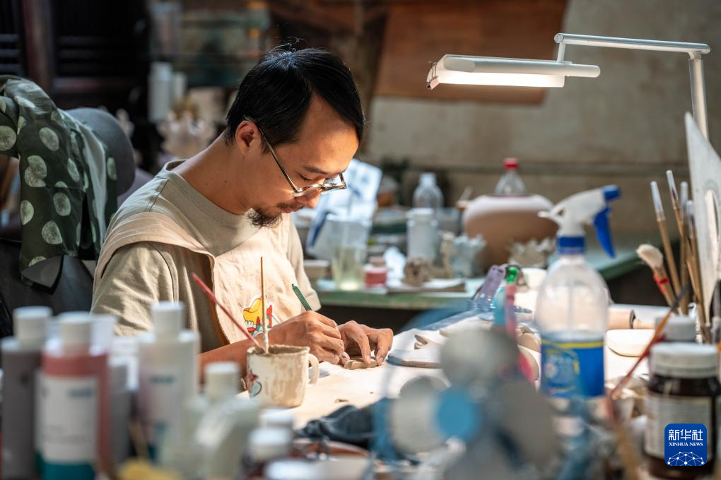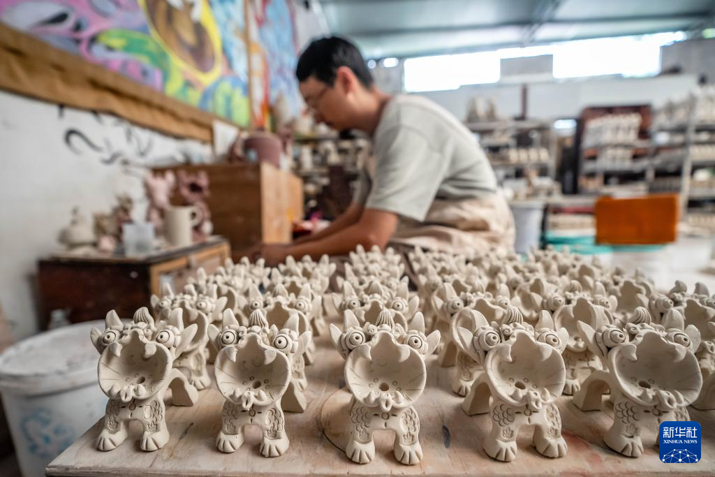 王(wang)子強(qiang)在工作室給晾曬好(hao)的瓦貓上釉(9月18日攝)。