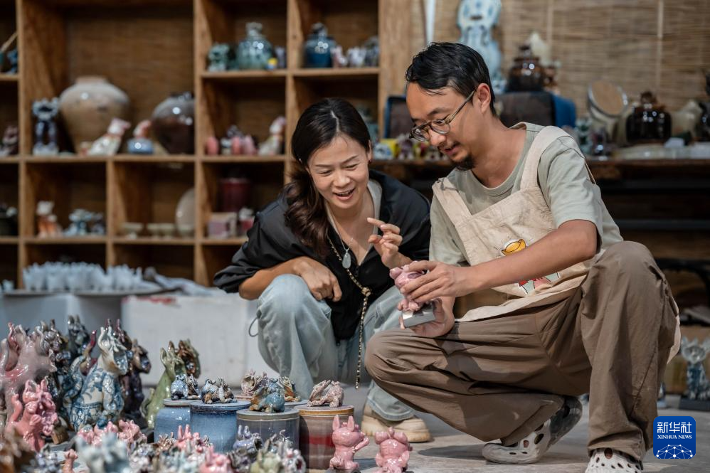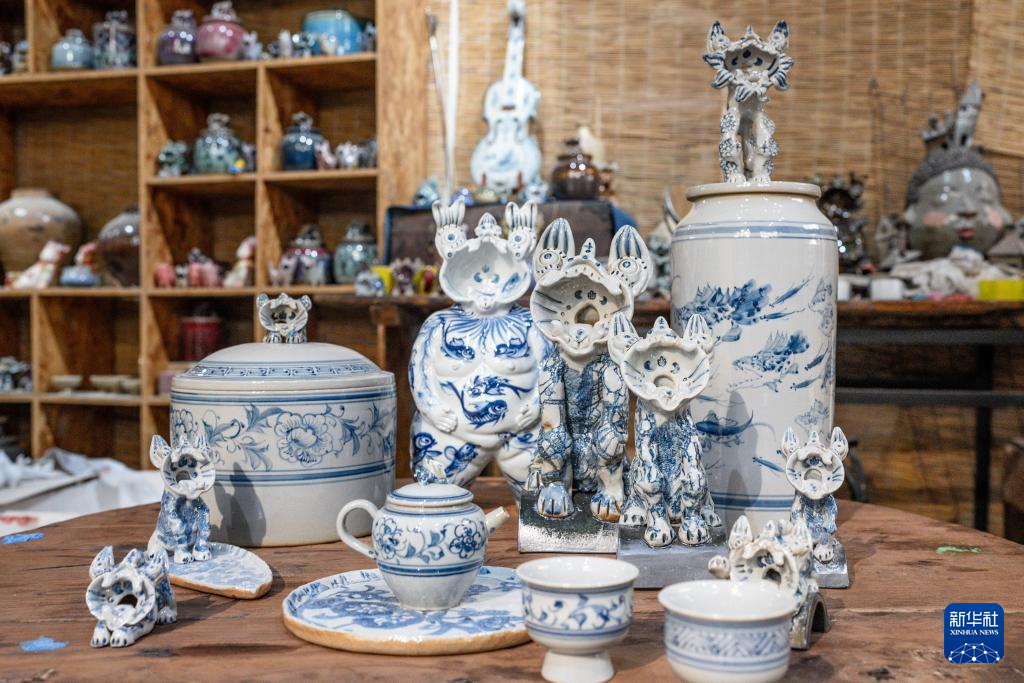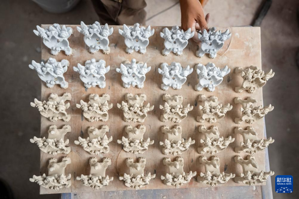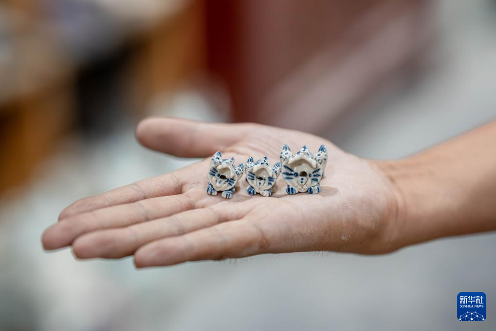 王子強(qiang)制作的(de)迷你款青花釉瓦貓(9月18日攝)。
