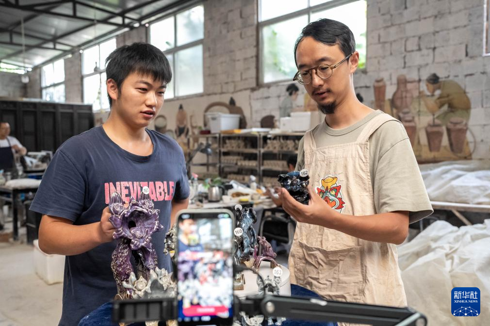王子強(右)通過(guo)網絡直播推介瓦貓(9月18日攝)。