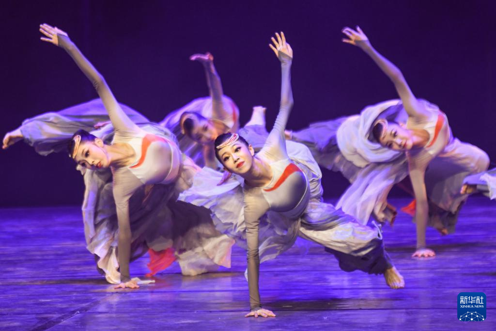 9月21日晚,黑龍江職業藝術學院師生表演舞蹈《絹(juan)花迎春》。