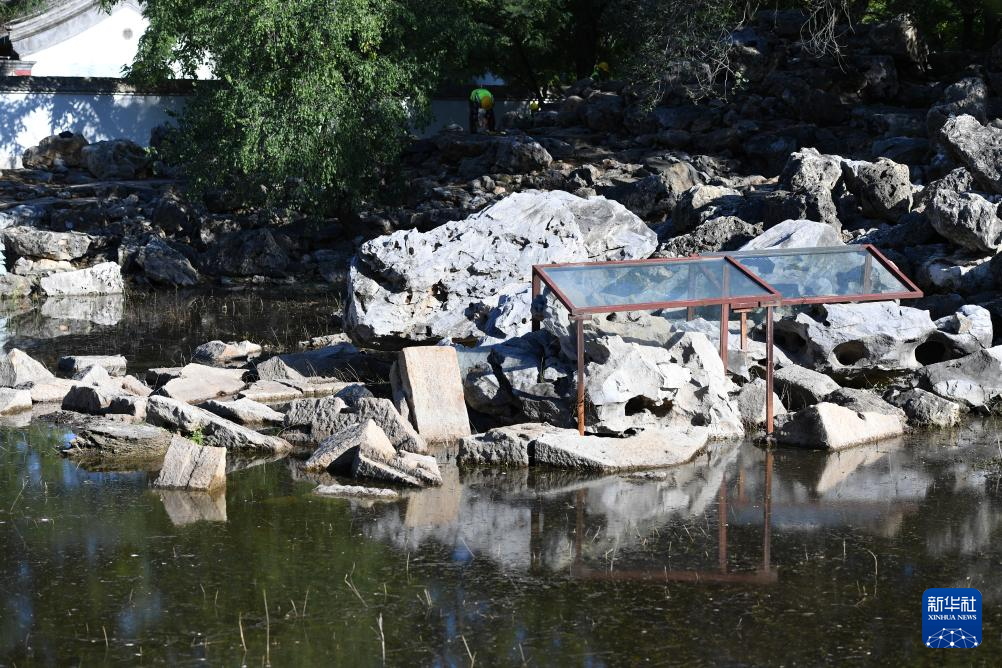 9月22日(ri)拍攝(she)的文(wen)源閣遺(yi)址湖(hu)池中(zhong)的“玲峰(feng)(feng)”石(shi)遺(yi)存。此石(shi)曾豎(shu)立于(yu)湖(hu)中(zhong),乾隆皇帝賜名“玲峰(feng)(feng)”。