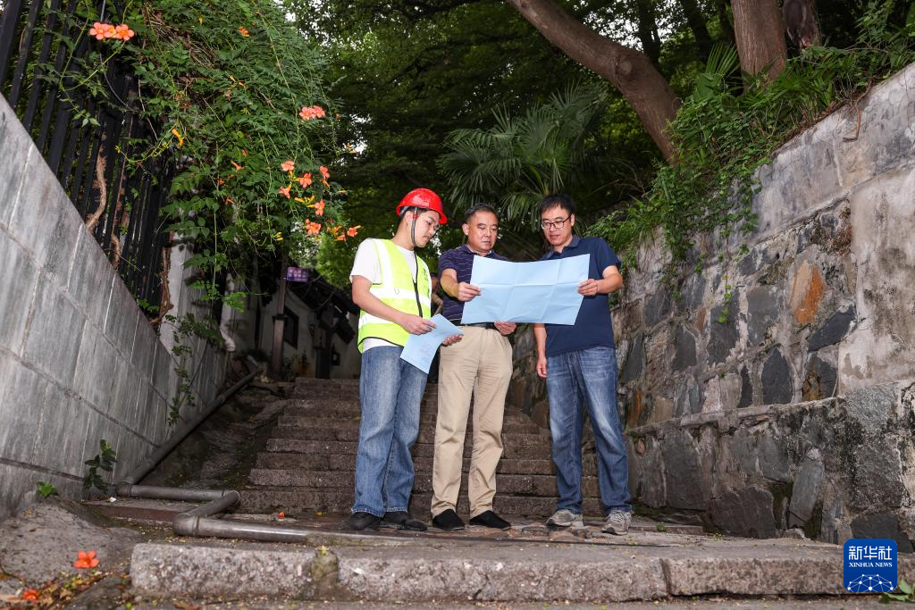 9月24日,潘(pan)守(shou)衛(wei)(中)與上城區紫(zi)陽街道十(shi)五奎巷社區工作(zuo)人(ren)員(右)、施工方代表一同(tong)商(shang)討(tao)御街二十(shi)三坊巷韻味提(ti)升項目施工細(xi)節(jie)。