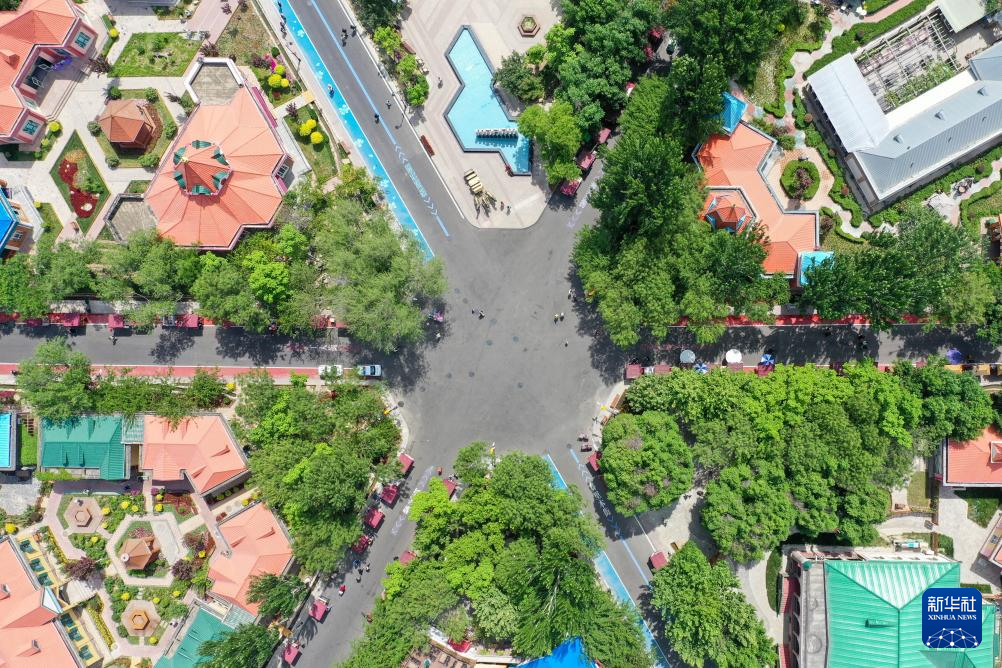 這是在新疆伊(yi)犁(li)哈薩克(ke)自治州伊(yi)寧市拍攝的六星街景(jing)區中心廣場(chang)(5月12日攝,無人機照片)。新華(hua)社記者 丁磊 攝