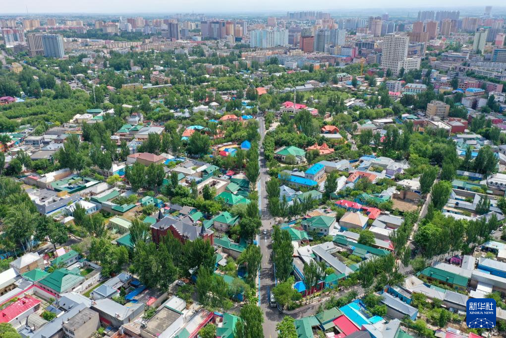 這是(shi)在新疆伊犁哈(ha)薩(sa)克自治州伊寧市拍攝的六(liu)星街景(jing)區(qu)(5月12日攝,無人機照片)。新華社記者 丁(ding)磊 攝