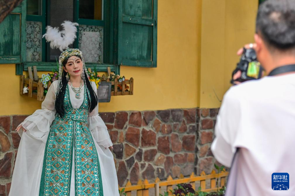 在新疆伊(yi)犁哈薩克自治州伊(yi)寧市六星街,游客體驗旅拍項目(7月(yue)28日攝)。新華社記者 丁磊 攝