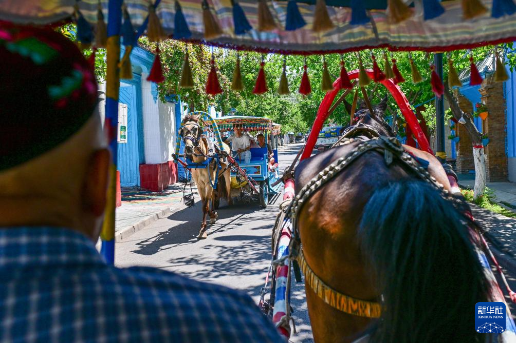 在新疆伊犁哈薩克自治州伊寧市喀贊其民俗旅游區,游客(ke)坐著馬車觀光游覽(7月27日攝)。新華社記(ji)者(zhe) 丁磊 攝