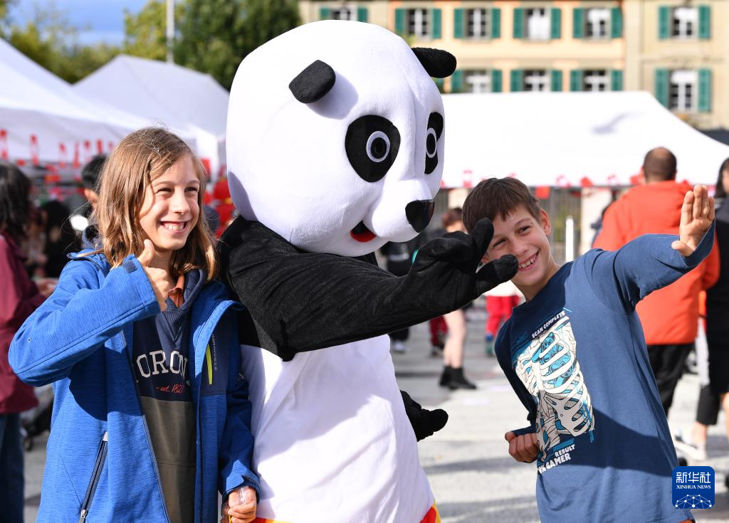 9月27日(ri),在瑞士伯(bo)爾(er)尼(ni)“遇見中國”文化節上,孩(hai)子們與扮(ban)成大熊貓的工作(zuo)人員合影。
