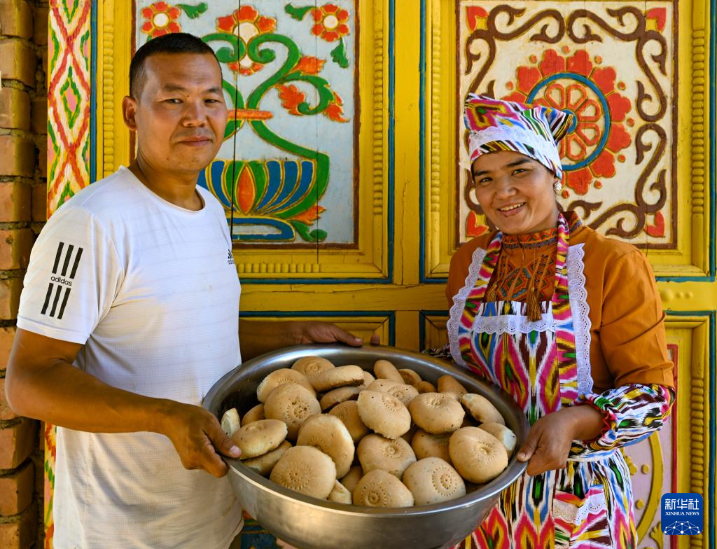 村(cun)民艾(ai)力·艾(ai)孜布(bu)力(左)和(he)妻子賽麗米罕·斯迪克展示剛烤制出爐(lu)的馕(10月8日攝)。