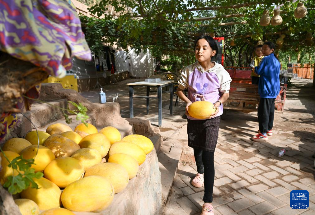 在新(xin)疆鄯善縣吐峪溝(gou)(gou)鄉(xiang)吐峪溝(gou)(gou)村,四(si)年(nian)級學(xue)生帕提(ti)古麗·阿不力提(ti)甫(左(zuo))在家中幫忙擺放哈密瓜,迎接游客(10月7日攝)。