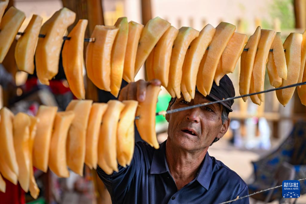 村民在吐峪溝內(nei)晾(liang)曬哈(ha)密(mi)瓜干(10月7日攝)。