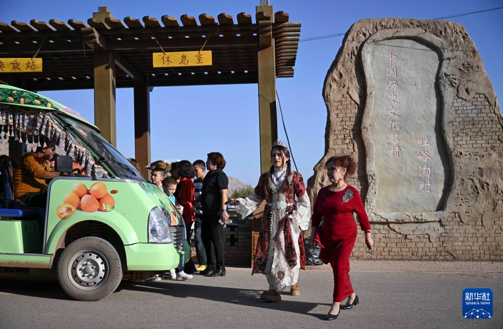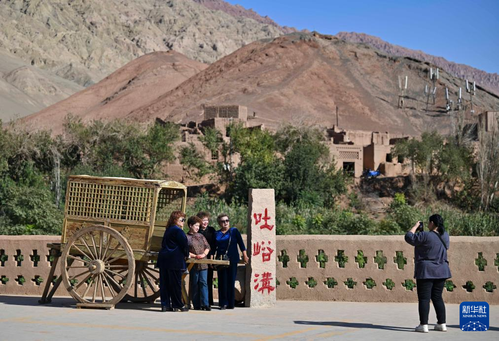 游(you)客在新疆鄯善縣吐(tu)峪(yu)溝(gou)(gou)鄉吐(tu)峪(yu)溝(gou)(gou)村合影(10月6日攝)。