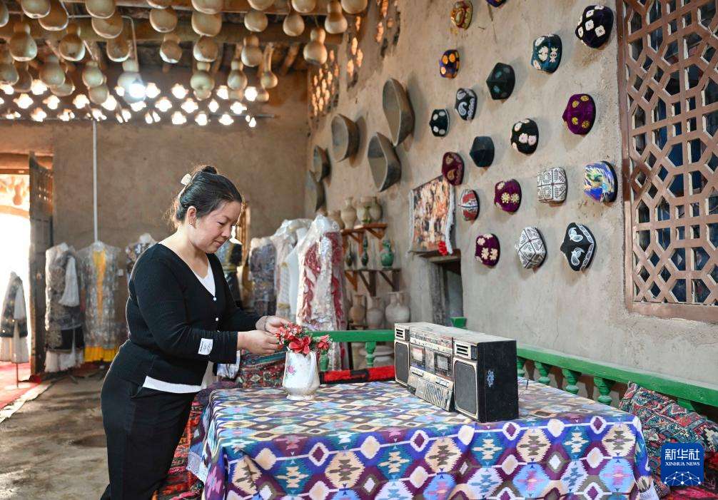 在新疆鄯善縣(xian)吐(tu)峪溝(gou)鄉吐(tu)峪溝(gou)村,村民艾力買·吾斯曼在家(jia)中整理擺件,準備(bei)迎接游(you)客(10月8日攝)。