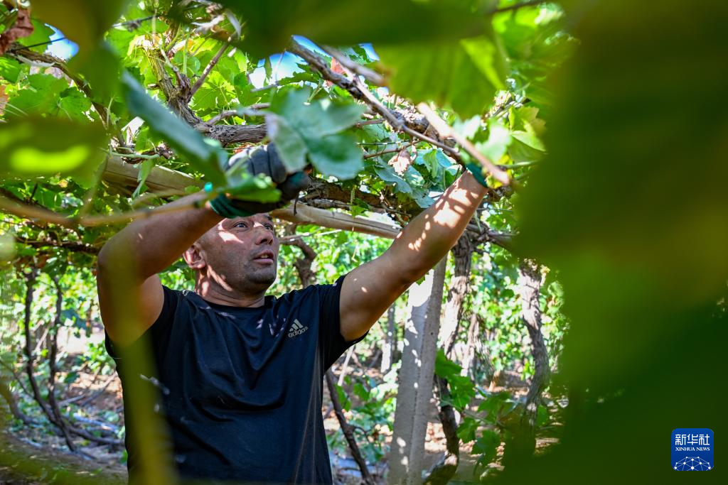 村民吾拉音·斯(si)迪(di)克在修剪葡萄葉(10月8日攝(she))。
