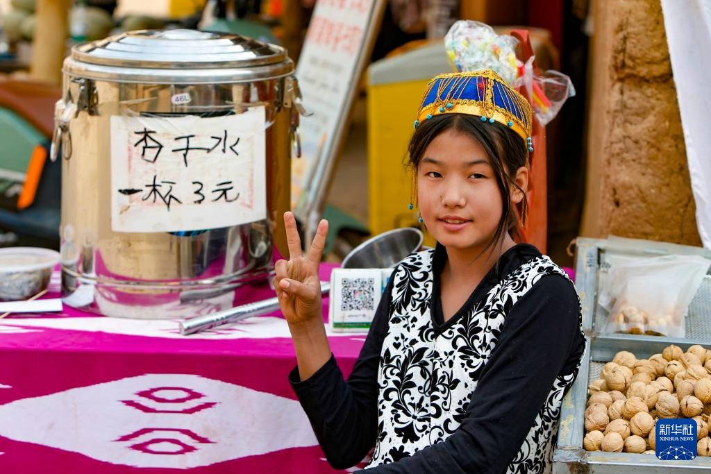 村民茹柯耶·艾合買提(ti)在吐峪溝景區(qu)內售賣(mai)杏(xing)干(gan)水(10月7日攝(she))。