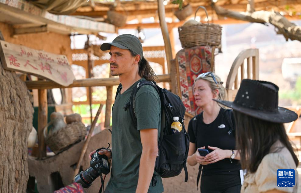 兩名國(guo)外游客(ke)在新(xin)疆鄯善縣(xian)吐(tu)(tu)峪溝鄉(xiang)吐(tu)(tu)峪溝村(cun)游玩觀光(10月6日攝(she))。