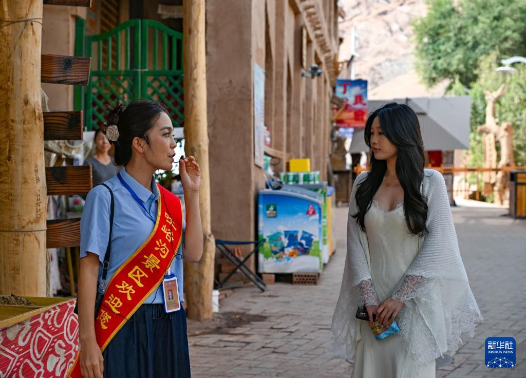 吐峪溝景(jing)區導游麥爾哈巴·阿卜力克木(左)在為(wei)游客介紹景(jing)區(10月(yue)7日攝)。