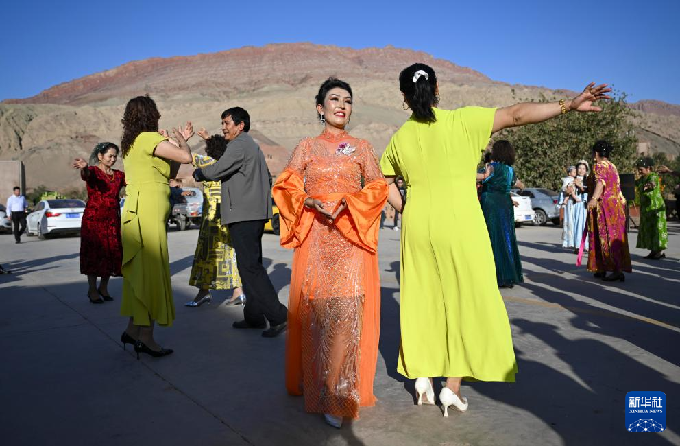 人們在新疆鄯(shan)善(shan)縣吐峪溝鄉(xiang)吐峪溝村(cun)跳舞(10月6日攝(she))。