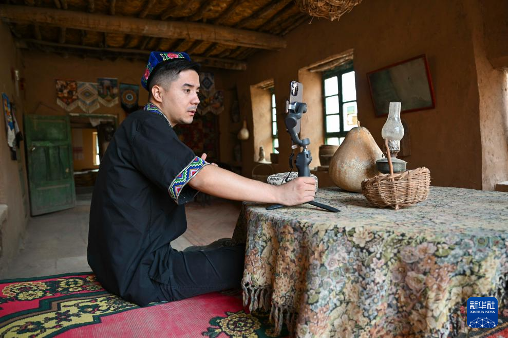 在(zai)新疆鄯善縣吐峪(yu)溝鄉吐峪(yu)溝村,一位(wei)青年主播(bo)向(xiang)網友介紹村里的風(feng)景、文化(hua)、特產等(10月7日攝)。