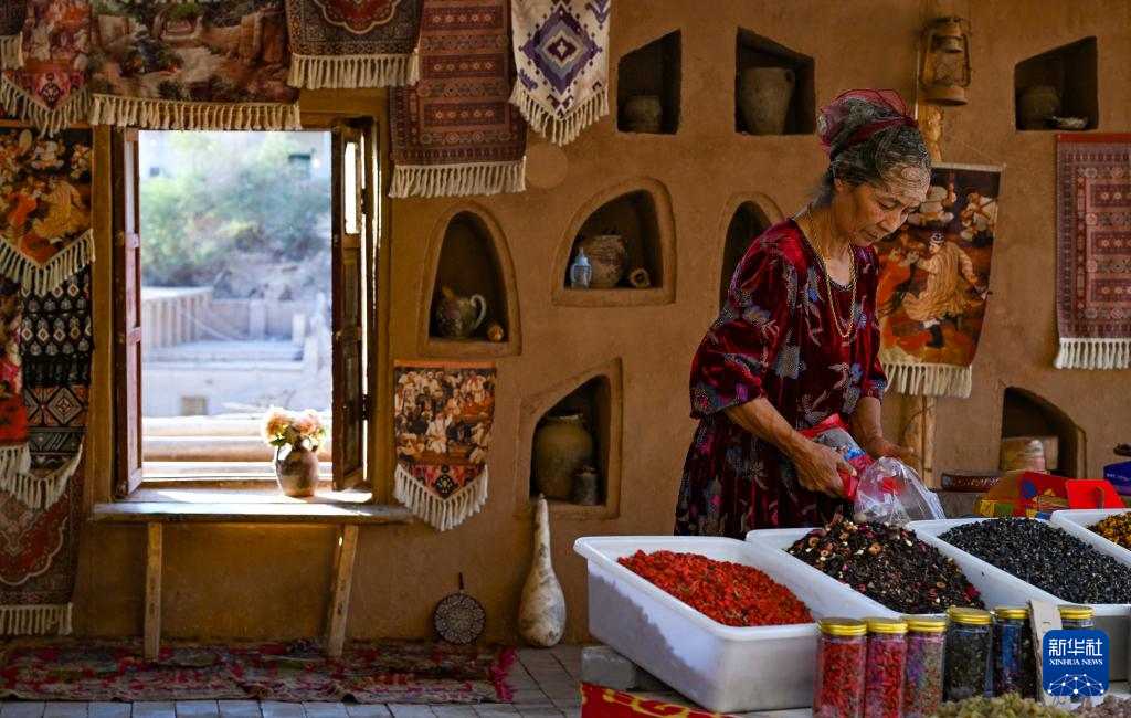 在新疆鄯善縣(xian)吐峪溝(gou)鄉吐峪溝(gou)村,村民努爾買買提·艾合買提在自(zi)家(jia)經(jing)營的飲品店(dian)內休息(10月(yue)7日攝)。他(ta)家(jia)房屋完成維修加固后,便投(tou)資(zi)開設了飲品店(dian),同時(shi)布置(zhi)了幾間房子供游客參觀。