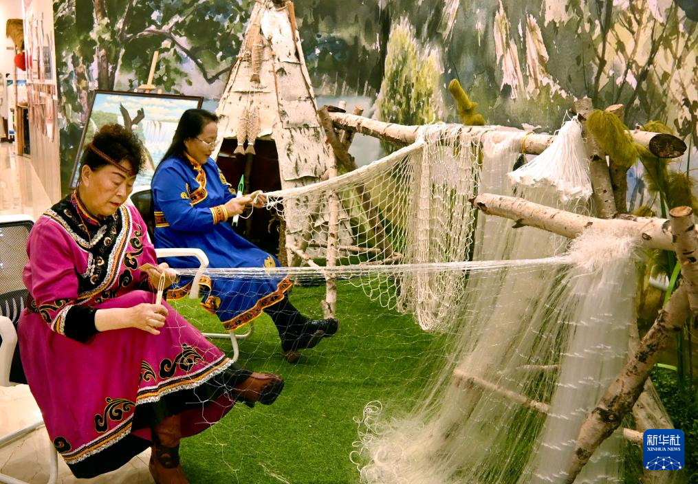 10月11日,在黑龍(long)江(jiang)省佳木(mu)斯同(tong)江(jiang)市非物質(zhi)文化(hua)遺(yi)產展(zhan)示館內,兩位(wei)赫(he)哲族婦女在為(wei)游(you)客展(zhan)示漁網編織技藝(yi)。