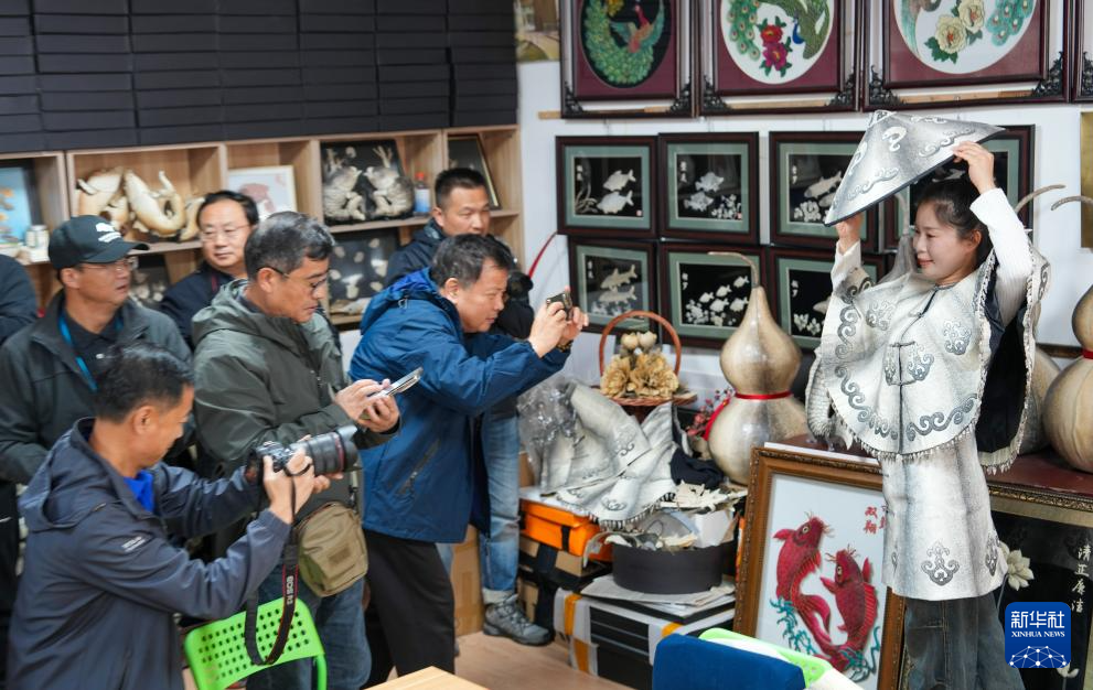 10月12日,在黑龍江省佳(jia)木斯撫遠市米比(bi)赫(he)哲工(gong)藝室,游客在試穿魚皮衣。