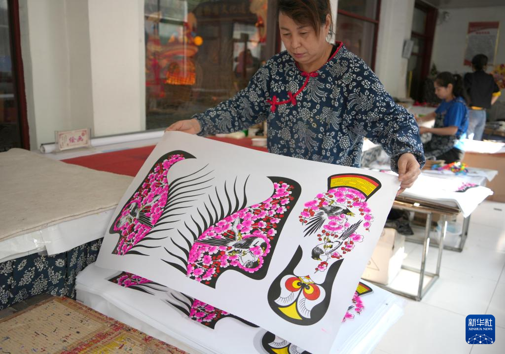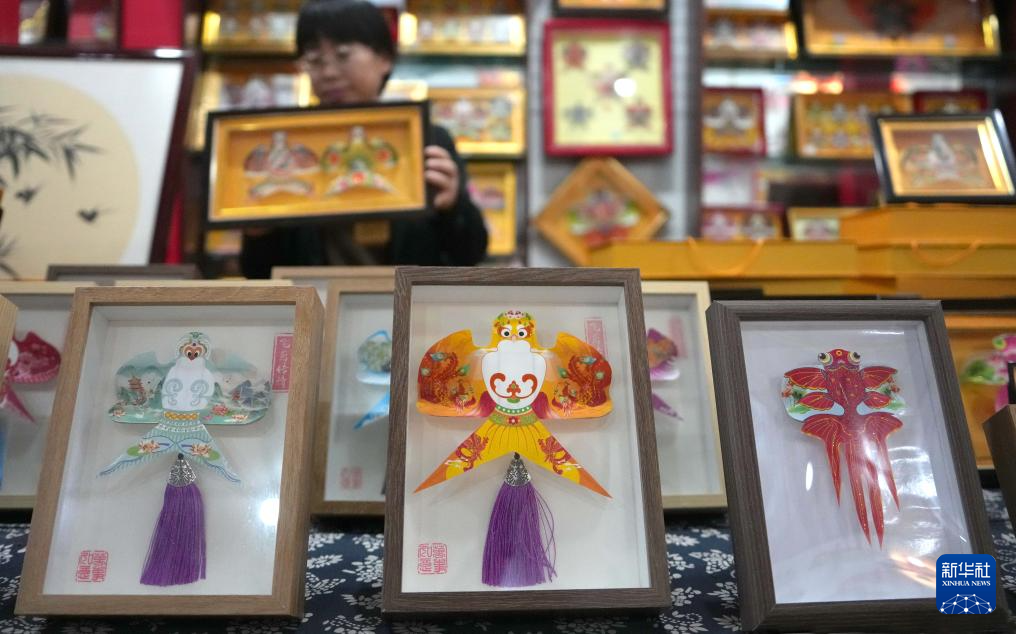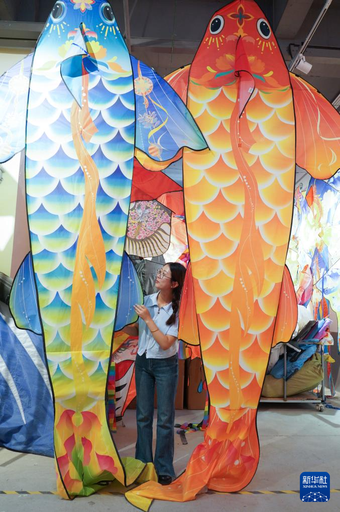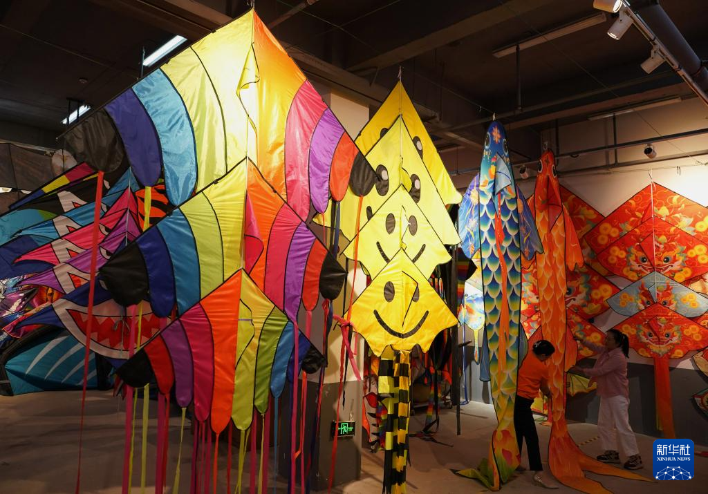 10月14日,在山(shan)東省濰坊市寒亭區的一(yi)家風(feng)箏生產(chan)企(qi)業,工作人(ren)員在展示風(feng)箏樣(yang)品。