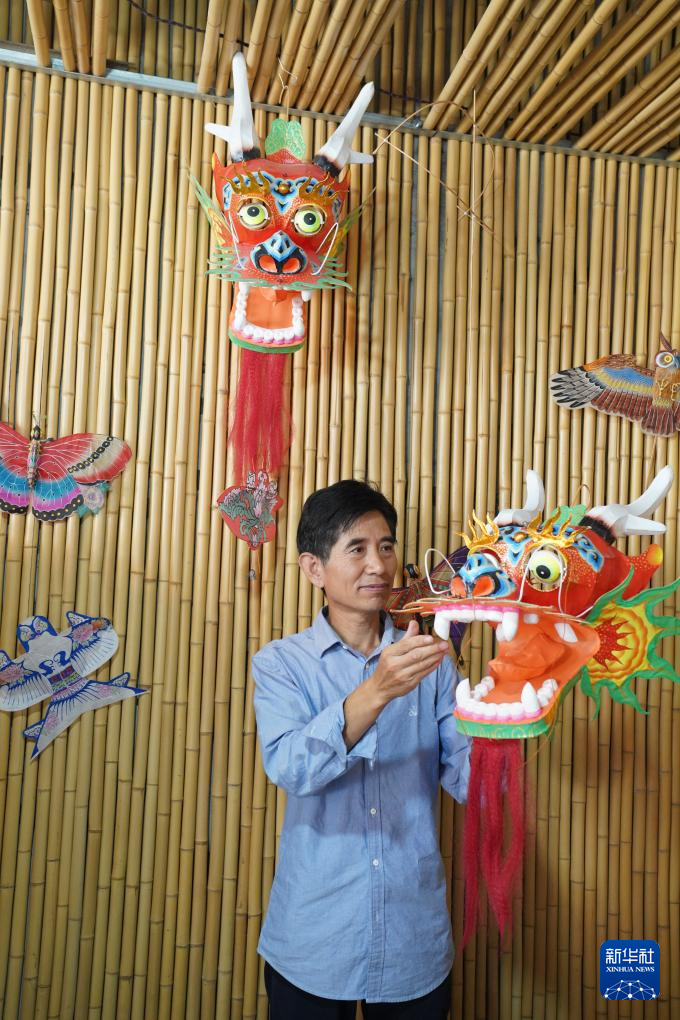 10月(yue)14日(ri),在(zai)山東省濰(wei)坊市(shi)寒亭區,風(feng)(feng)箏制作技藝非遺(yi)傳承人郭洪利在(zai)展示(shi)傳統龍頭風(feng)(feng)箏。