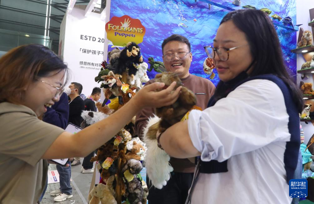10月16日,一(yi)位(wei)參觀(guan)者(左(zuo))在一(yi)家(jia)仿真(zhen)毛絨玩具展商(shang)的(de)展臺上撫摸一(yi)個松鼠玩偶。