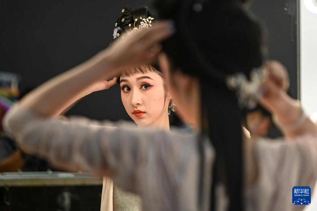 10月18日,在(zai)馬來西亞吉隆坡,錫劇《追(zhui)香記》的演員(yuan)們在(zai)后臺做(zuo)表演前的準備。