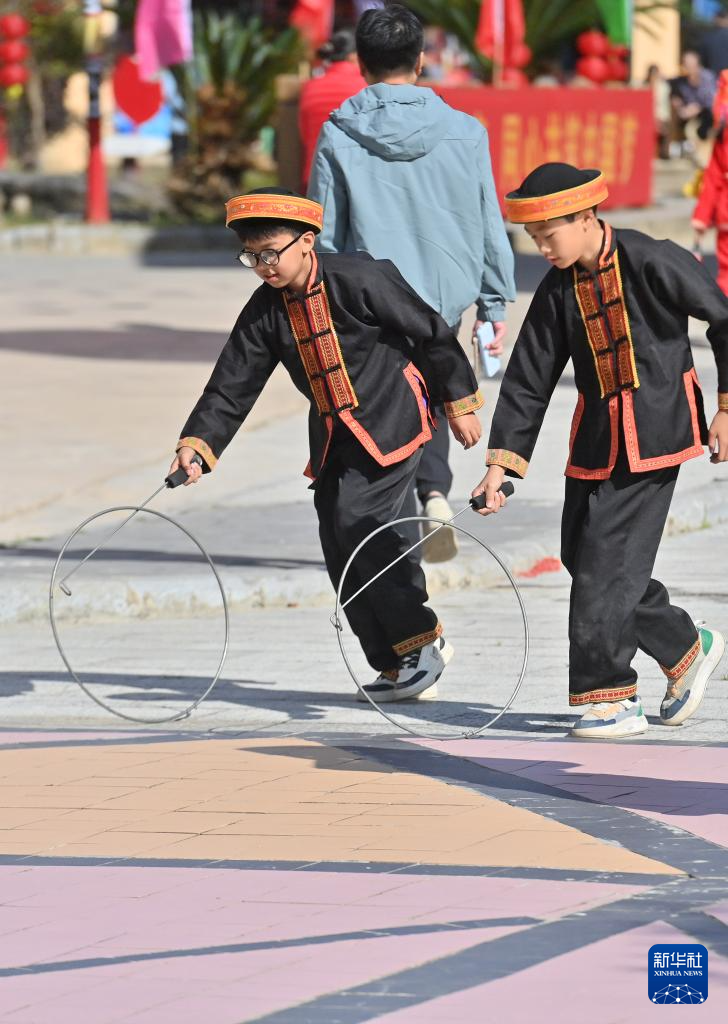 10月23日,瑤(yao)族少年在梧(wu)州市(shi)蒙山縣長坪瑤(yao)族鄉圖騰廣場滾(gun)鐵環。